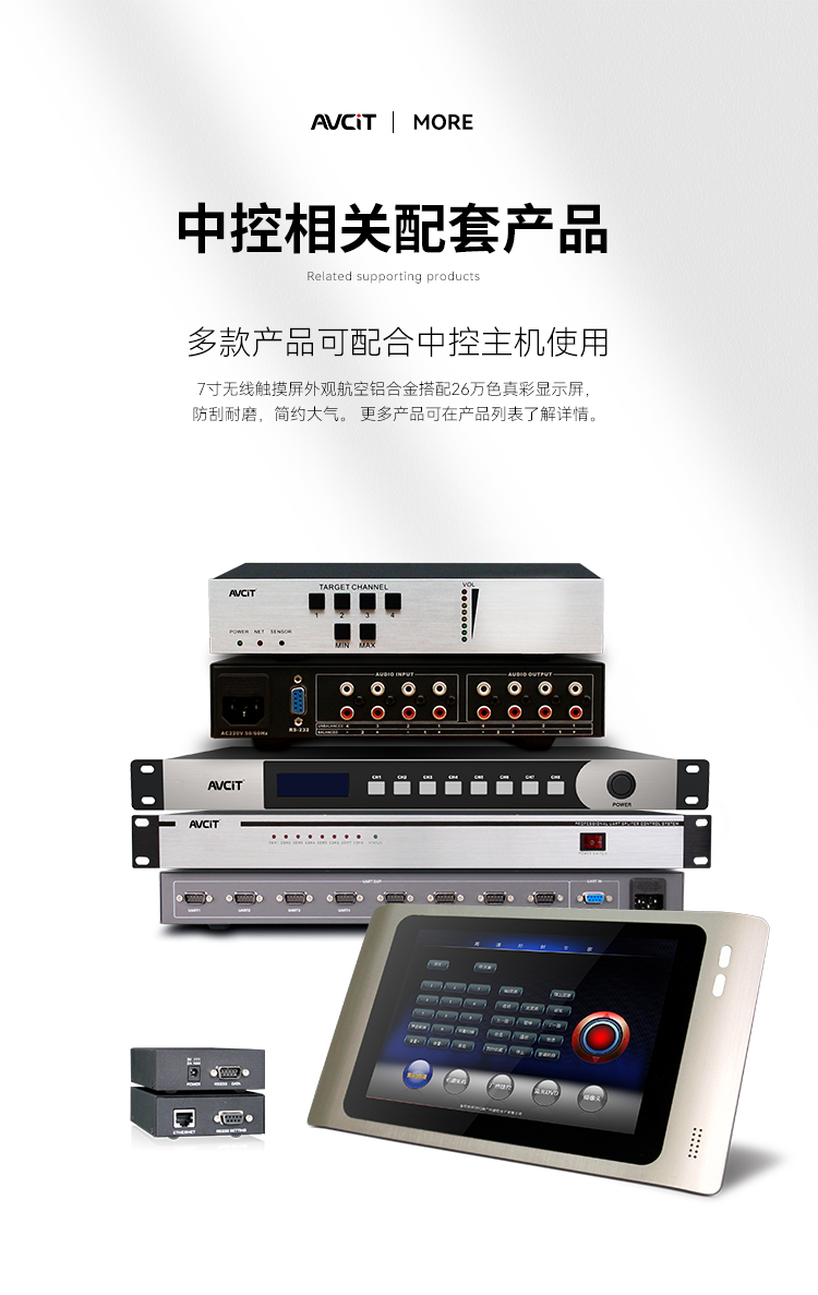 多款產(chǎn)品可配合中控主機(jī)使用,7寸無(wú)線(xiàn)觸摸屏外觀(guān)航空鋁合金搭配26萬(wàn)色真彩顯示屏,防刮耐磨,簡(jiǎn)約大氣。 更多產(chǎn)品可在產(chǎn)品列表了解詳情。