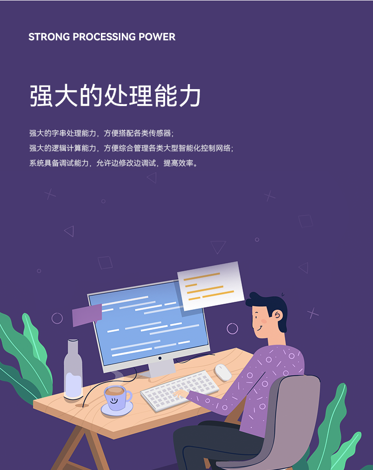 強大的字串處理能力,方便搭配各類傳感器;強大的邏輯計算能力,方便綜合管理各類大型智能化控制網(wǎng)絡(luò);系統(tǒng)具備調(diào)試能力,允許邊修改邊調(diào)試,提高效率。