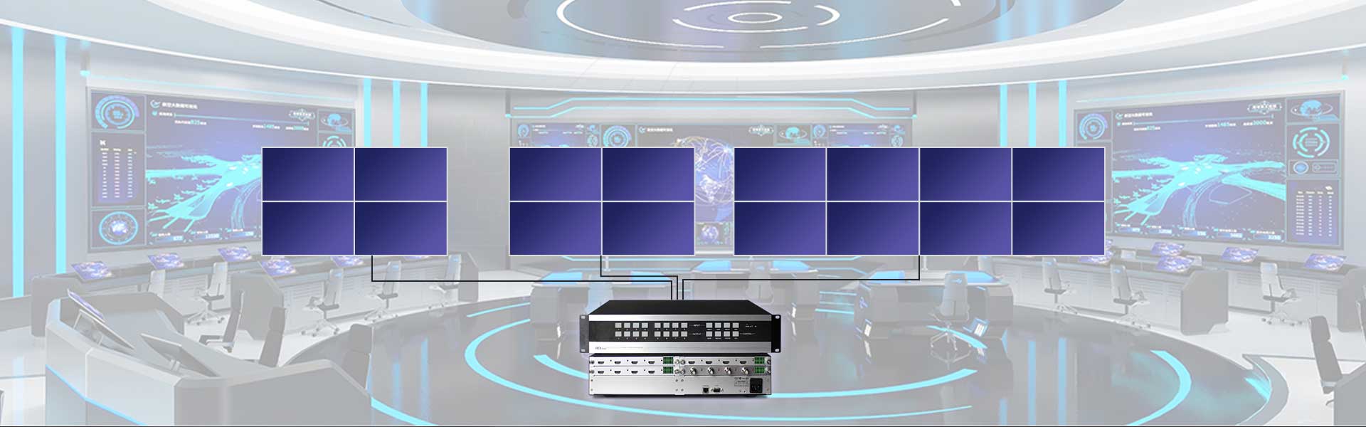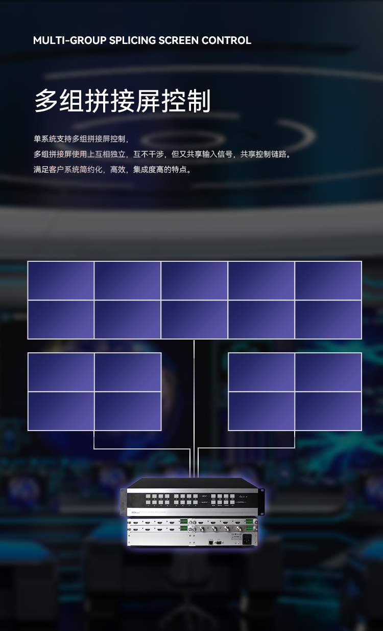 單系統(tǒng)支持多組拼接屏控制,多組拼接屏使用上互相獨立,互不干涉,但又共享輸入信號,共享控制鏈路。滿足客戶系統(tǒng)簡約化,高效,集成度高的特點。