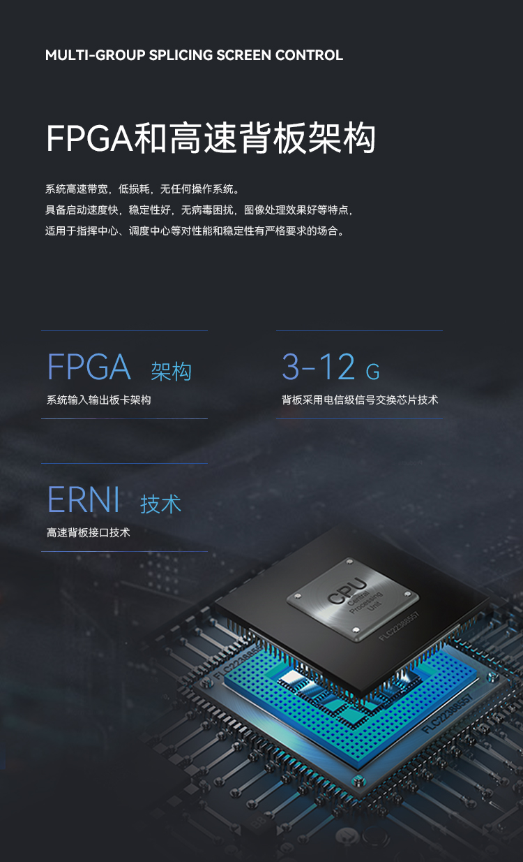 系統(tǒng)采用輸入輸出板卡全FPGA架構(gòu),背板采用電信級3-12G信號交換芯片技術(shù),以及德國ERNI高速背板接口技術(shù),高速高帶寬,低損耗,無任何操作系統(tǒng)。具備啟動速度快,穩(wěn)定性好,無病毒困擾,圖像處理效果好等特點,適用于指揮中心、調(diào)度中心等對性能和穩(wěn)定性有嚴格要求的場合。
