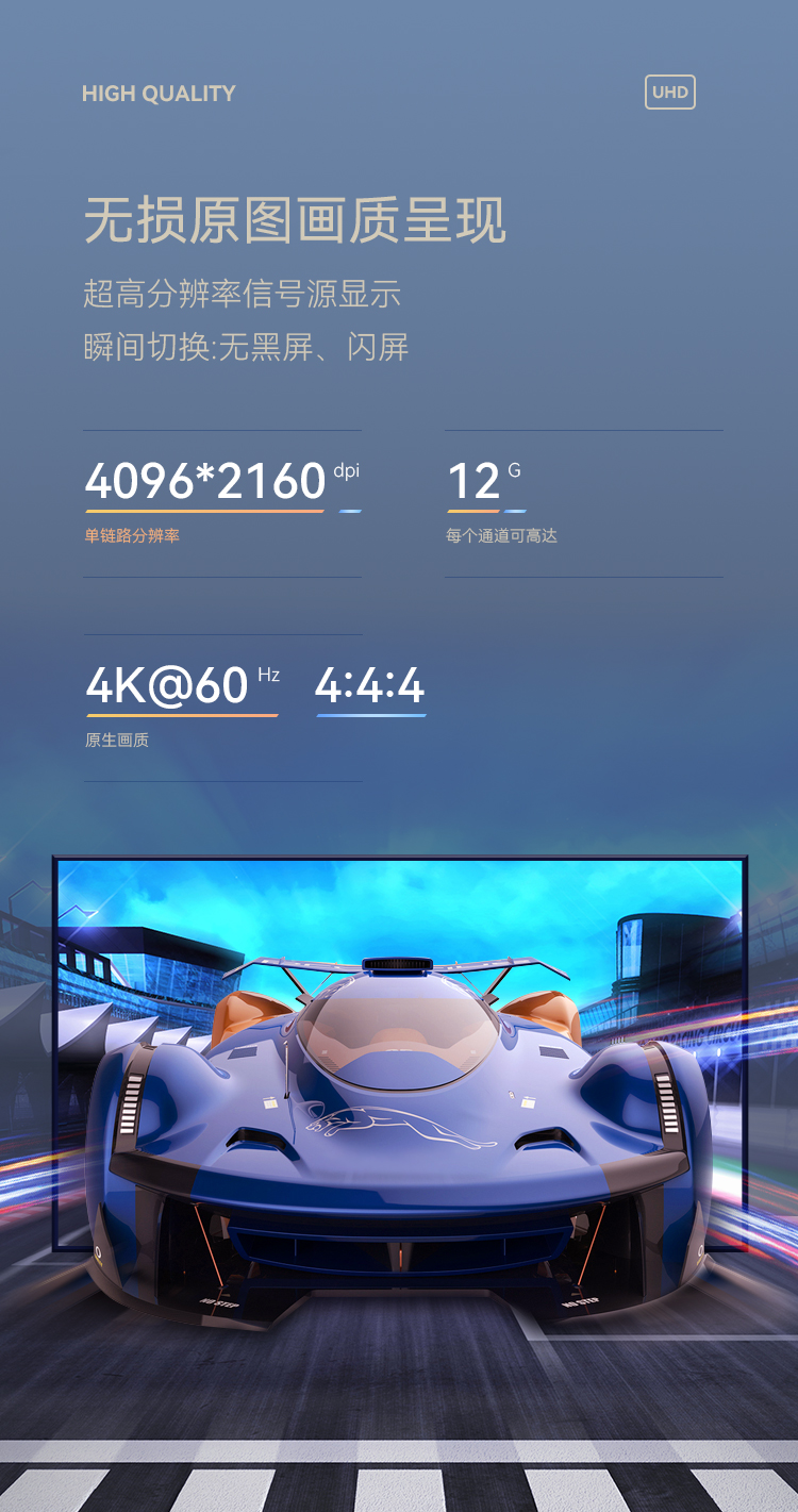 【每個通道可高達(dá)12G 】【單鏈路分辨率 4096*2160】【超高分辨率信號源顯示】【瞬間切換:無黑屏、閃屏】【 4K@60 4:4:4 原生畫質(zhì)】