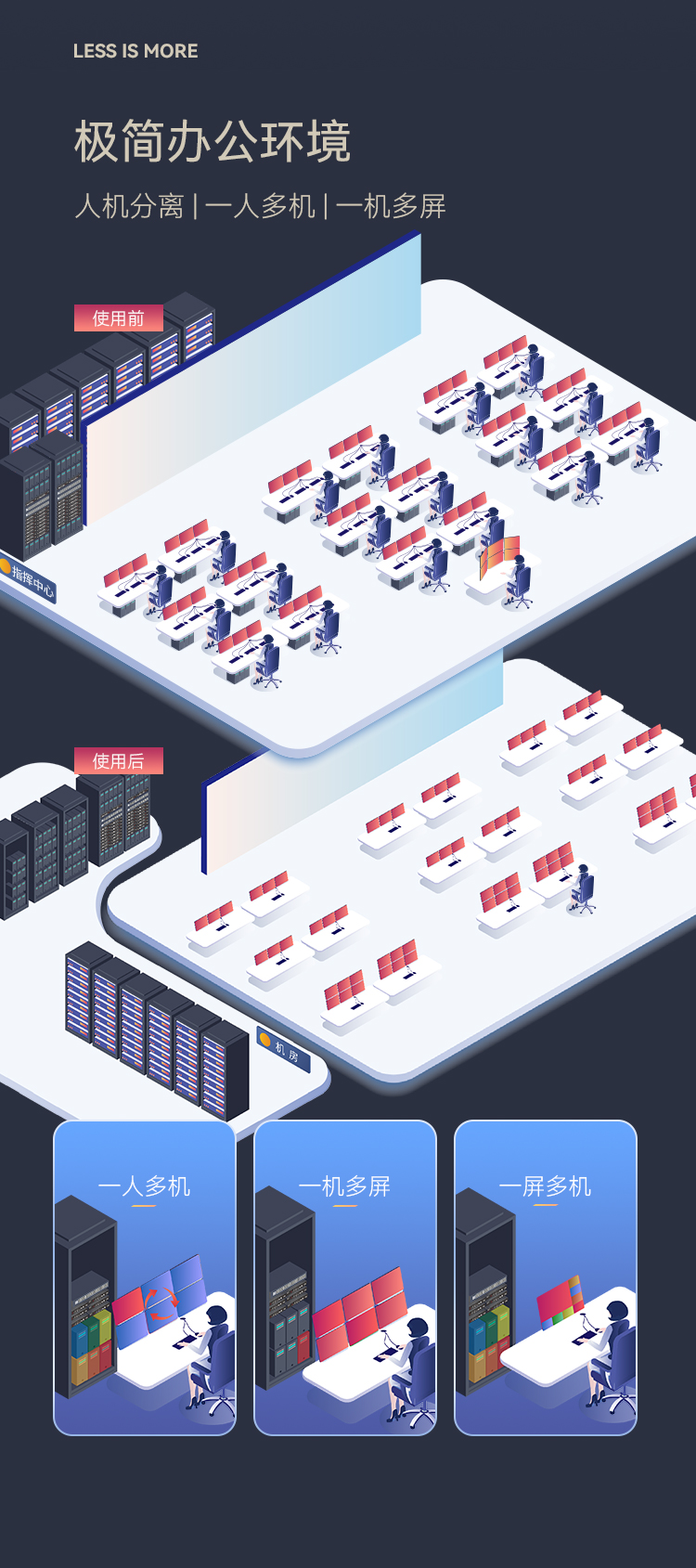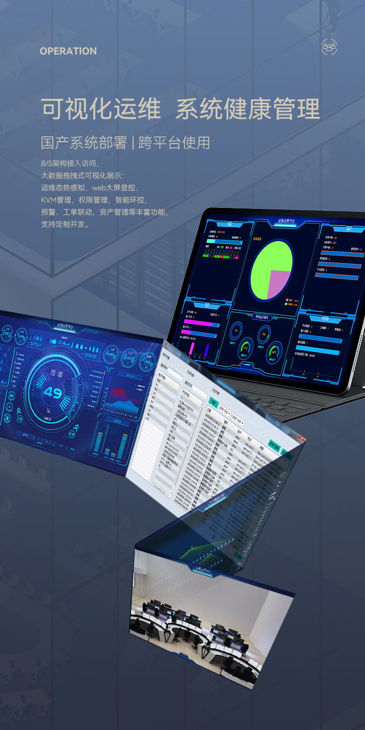 B/S架構(gòu)接入訪問,大數(shù)據(jù)拖拽式可視化展示:運(yùn)維態(tài)勢感知,web大屏顯控、KVM管理,權(quán)限管理,智能環(huán)控,預(yù)警、工單聯(lián)動,資產(chǎn)管理等豐富功能,支持定制開發(fā)。