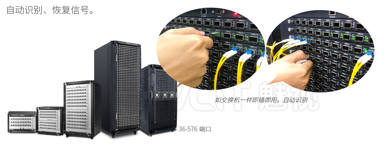 Phinx系統(tǒng)主機可根據(jù)需求從 36-576 光纖端口之間進行配置。每一個光纖端口均為全功能端口,既能支持接入輸入節(jié)點,也能支持接入輸出節(jié)點。無需在Phinx系統(tǒng)主機上進行配置,任意輸入和輸出節(jié)點連接主機的方式如網(wǎng)絡交換機一樣,在任意端口上進行即插即用,自動識別、恢復信號。 |