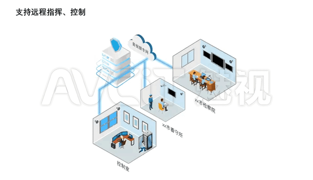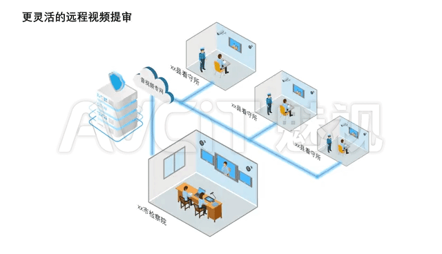 通過(guò)在各檢察院,看守所部署分布式系統(tǒng),借助現(xiàn)有的視頻專(zhuān)網(wǎng)進(jìn)行系統(tǒng)組網(wǎng),即可進(jìn)行各方之間跨區(qū)域的高清音視頻傳遞與設(shè)備智能化控制。